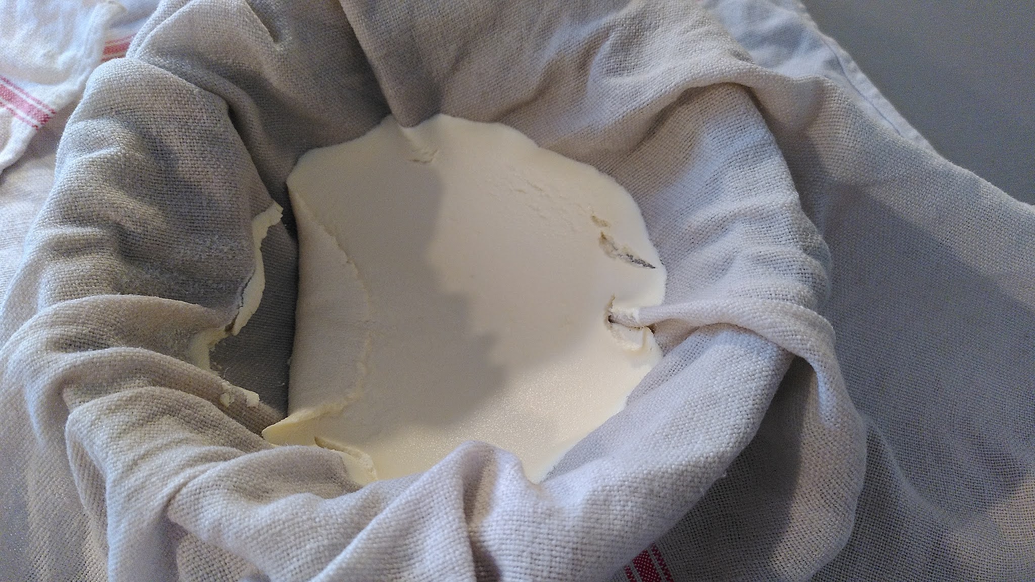 - Placer une étamine ou un torchon propre sur une passoire, au dessus d’un récipient. Verser le contenu du thermomix pour l’égouter. Normalement, le caillé (le fromage donc) reste dans l’étamine, et le petit lait s’égoutte. Laisser égoutter pendant 1h à 2h (en vrai 1h ça suffit, il reste un chouilla de petit lait dedans mais c’est insignifiant. Si vous êtes pressé∙e ne vous embêtez pas avec le 2h !). Presser un peu l’étamine à la fin pour finir d’égoutter le petit lait, et mettre le fromage dans un pot en verre au frigo.