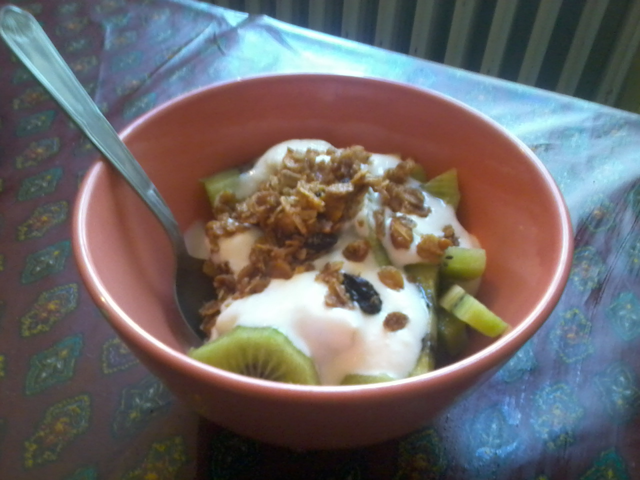 Hier j’ai essayé de faire des flapjacks, ça a complètement foiré, mais le résultat est assez proche d’un bon granola, donc je l’ai testé au petit dej!