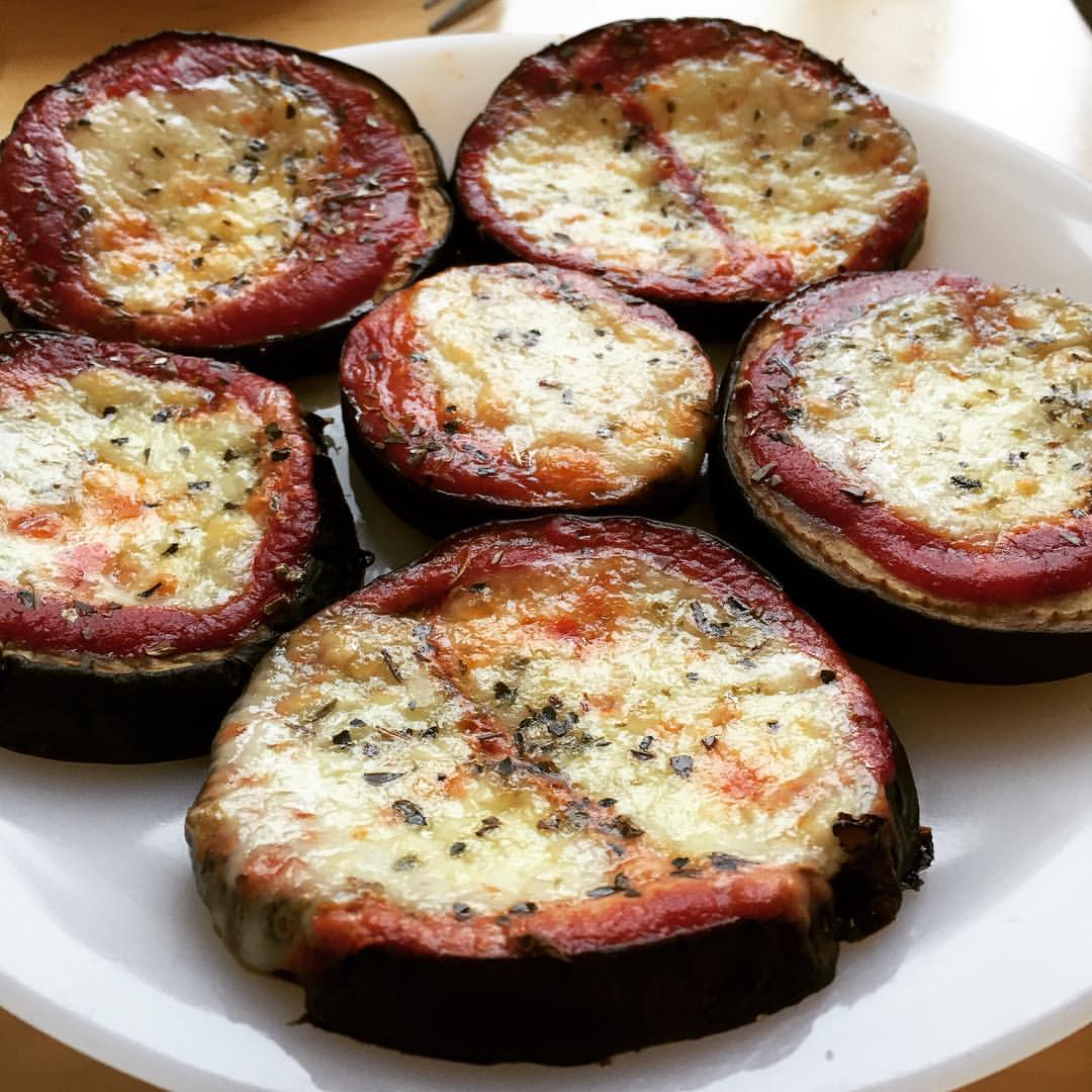 - Sortez les aubergines du four, couvrez-les de tomate, d’une rondelle de mozza et éventuellement de parmesan, saupoudrez d’origan et mettez le tout au four.