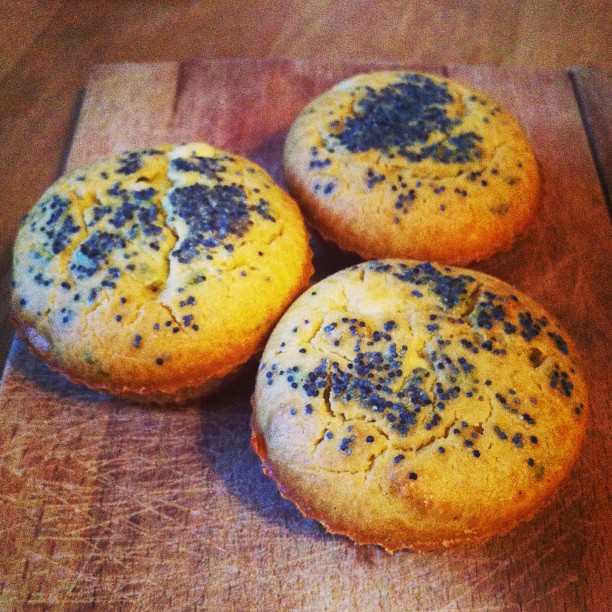 Ensuite on mélange les deux le moins possible, on met vite dans des petits moules, on saupoudre de pavot ou de sésame parce que c’est joli, et on enfourne !