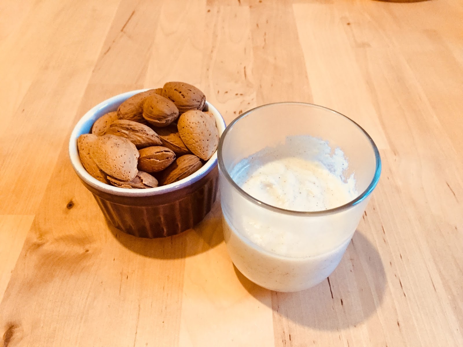 - Faites tremper 60g d’amandes (ou de noix de cajou ou de noisettes ou de n’importe quel autre oléagineux) entre 2h et une nuit.
